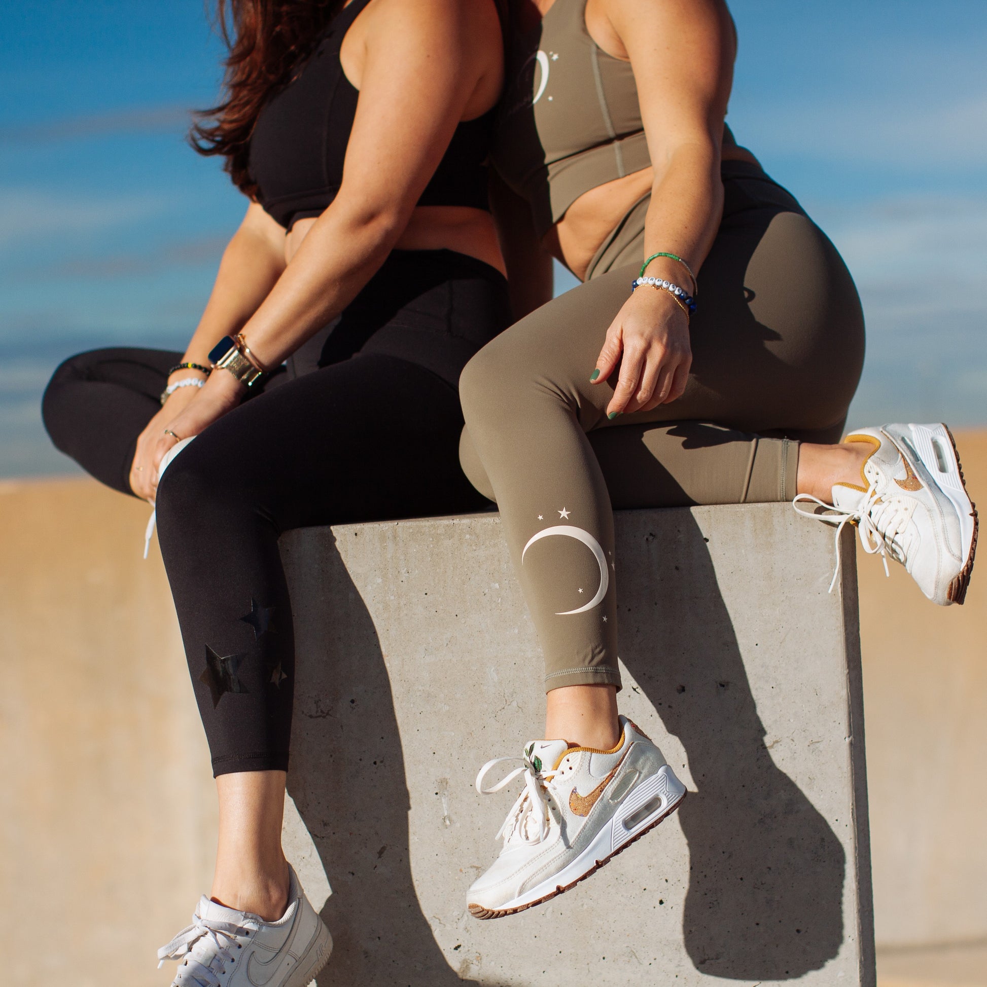 These olive green, high waisted tights are buttery soft and weightless. A cream moon and stars logo printed in a rubber material is found on the left calf. Our signature sweat love soul is printed in the same cream colored rubber wrapping around the right hip.