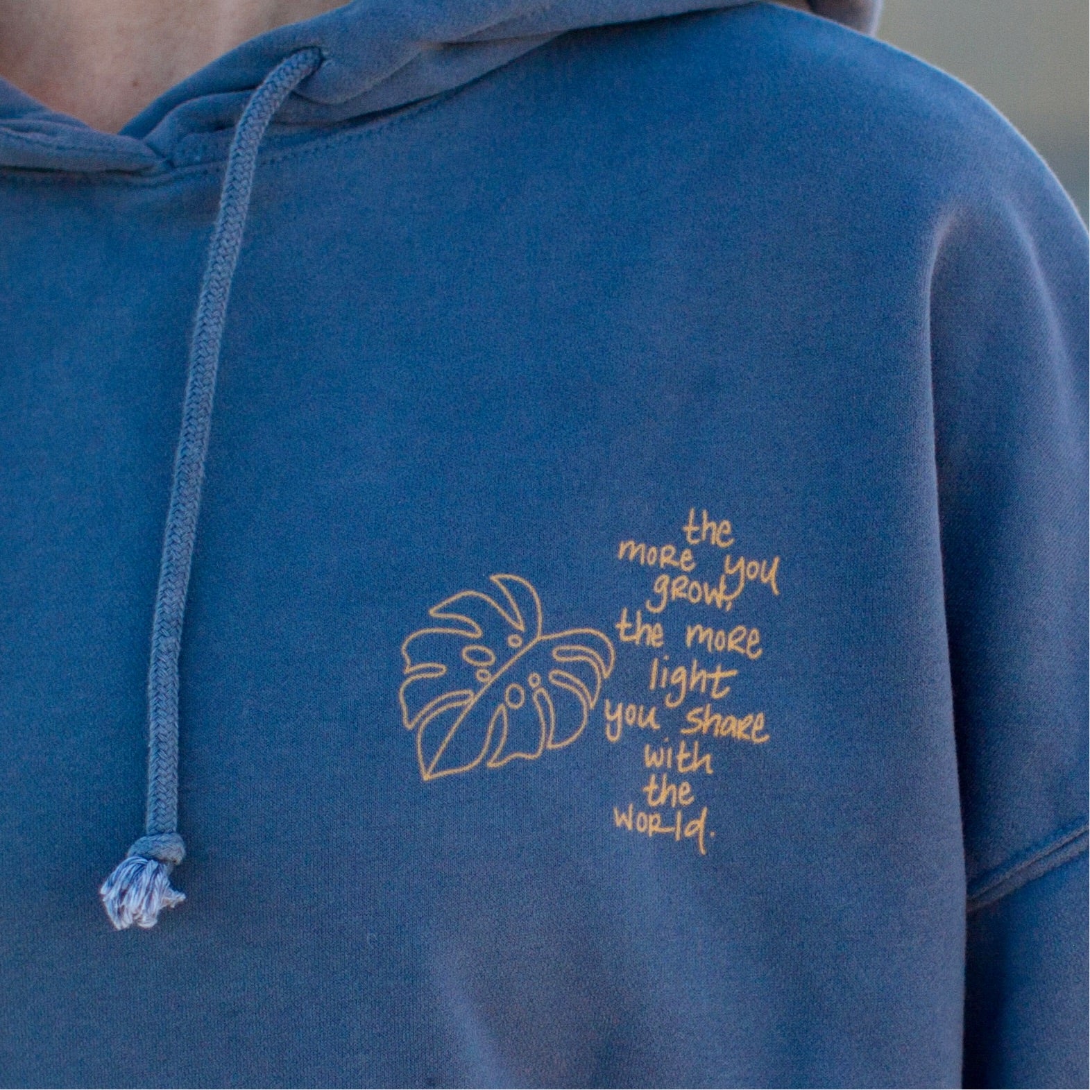 A hand-drawn monstera leaf with a simple reminder that "the more you grow, the more light you share with the world" on the left chest. logos are in our signature pop of yellow color.