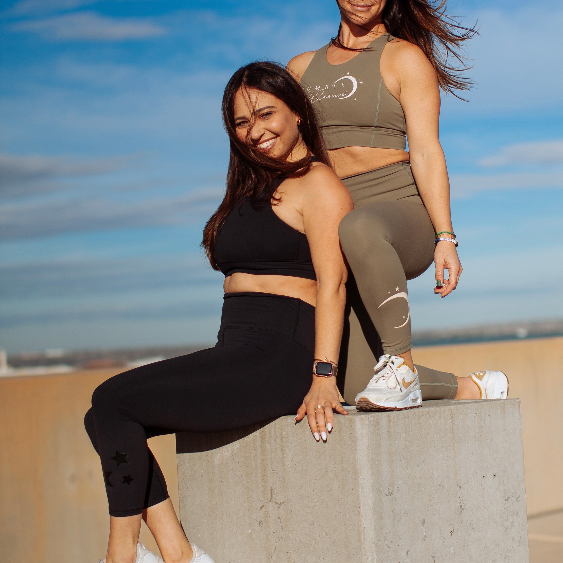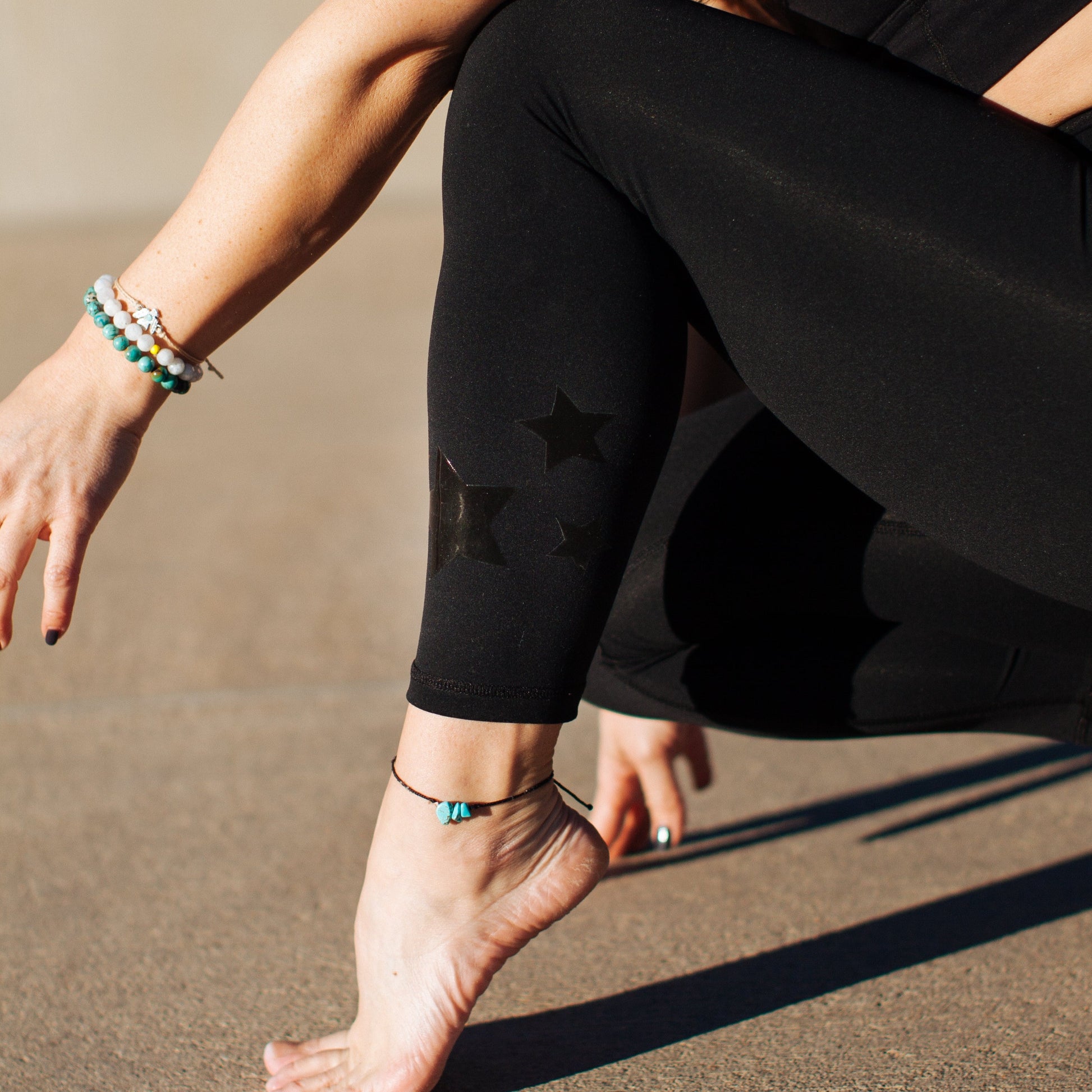 Whether you are wearing them out on the town or during a killer sweat, these tights are ones to love. 3 rubber black stars are found on the left calf, while our signature sweat love soul is wrapping around your right hip.