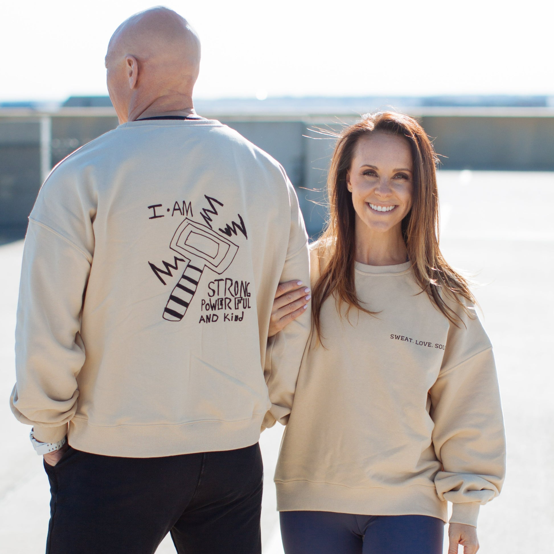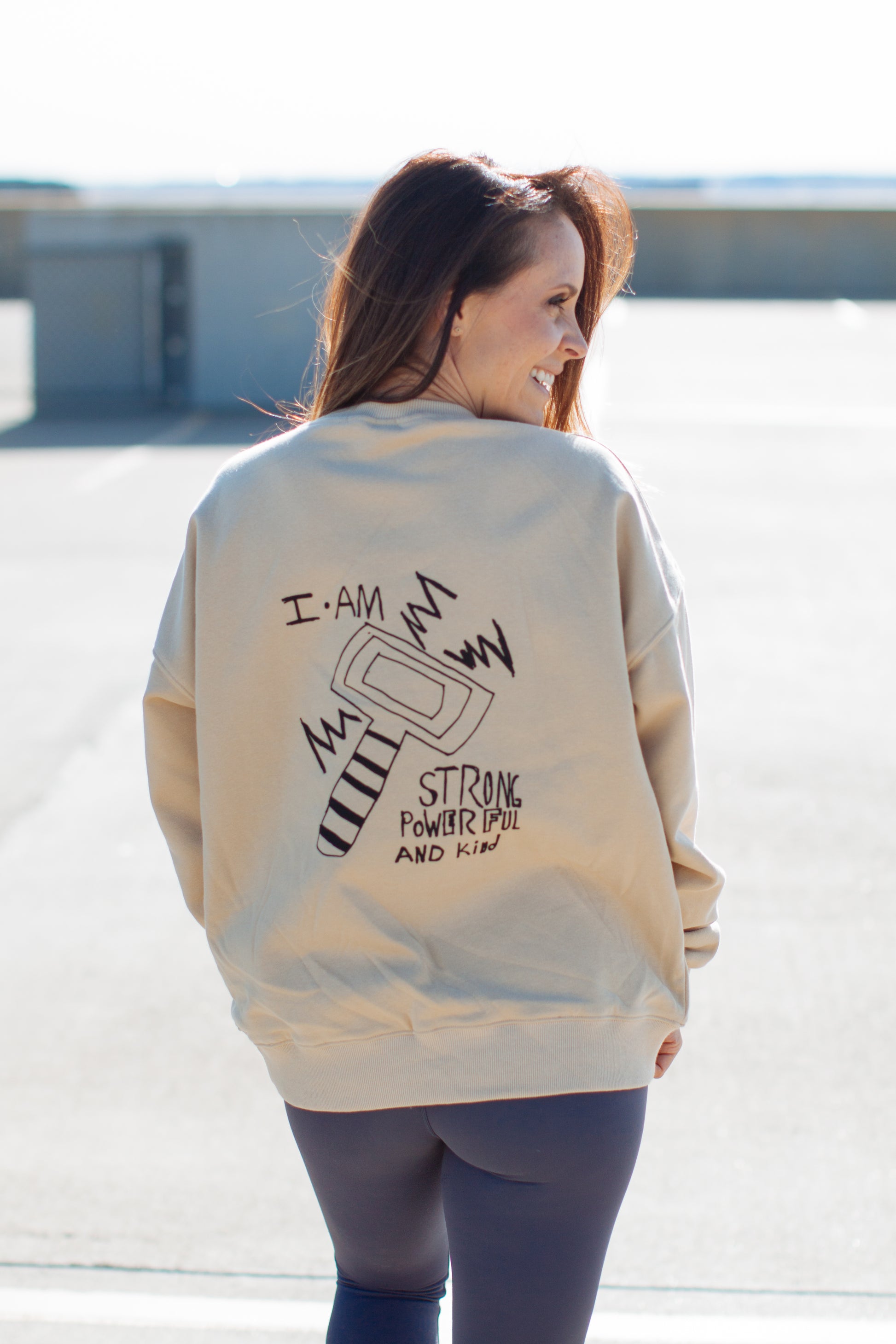 Oversized unisex crew neck sweatshirt is going to be your new favorite. With our signature Thor's hammer design on the back and our sweat love soul logo on the front. Design created by our 11 year old designer.