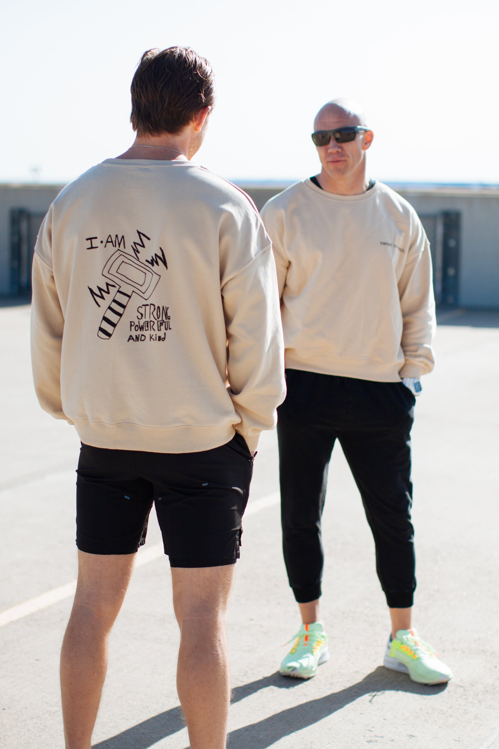A deep cream beige cozy crew neck with our best selling thor's hammer on the back.