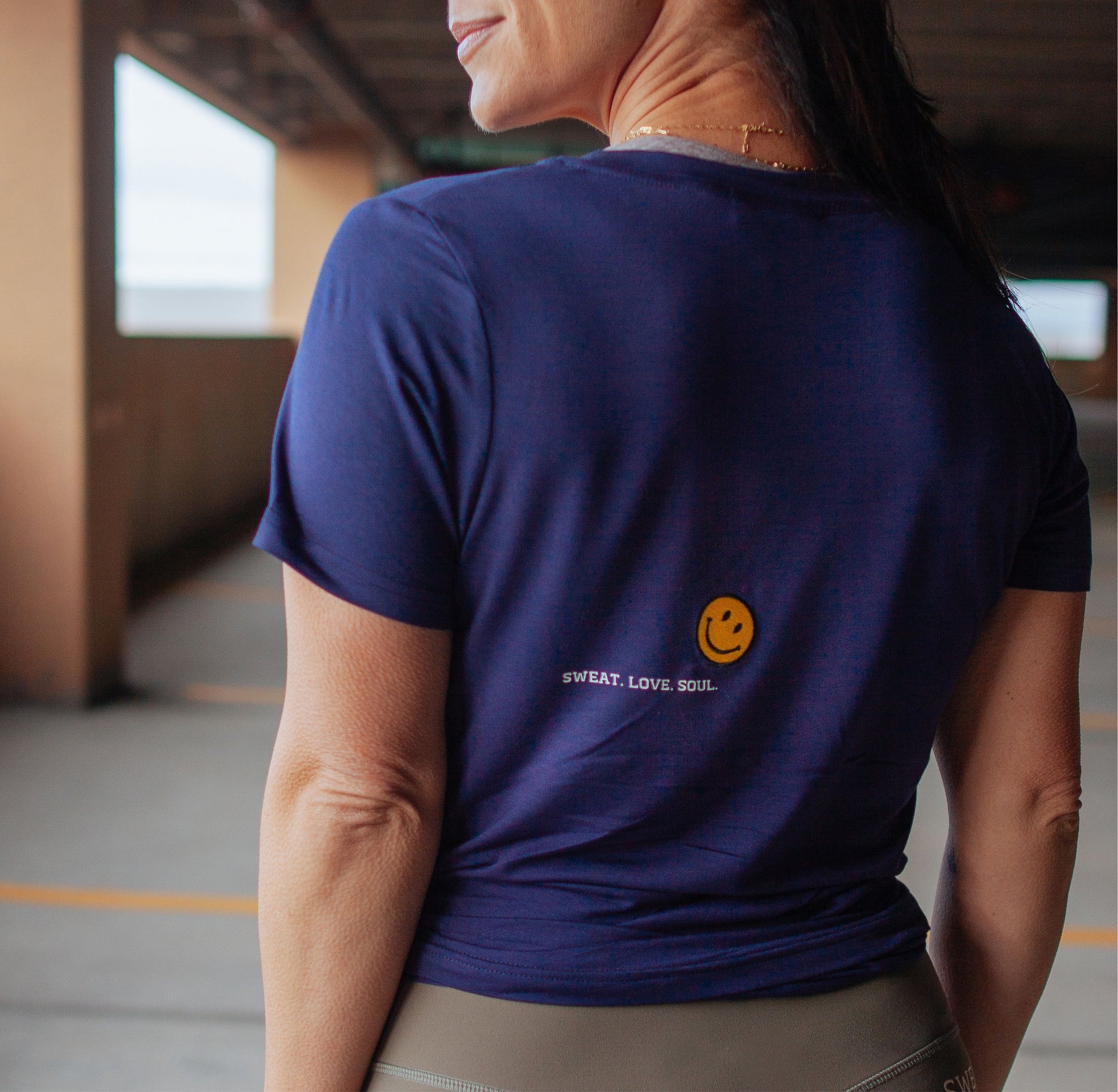 The logo on front was hand created by our owner. A beautiful moon, shining stars, and whimsical feather with the words "trust the universe". A simple reminder to believe your angels are near and that you must trust what the universe has in store for you. The back has our signature sweat.love.soul logo with a smile face patch to give you a little sunshine every day.